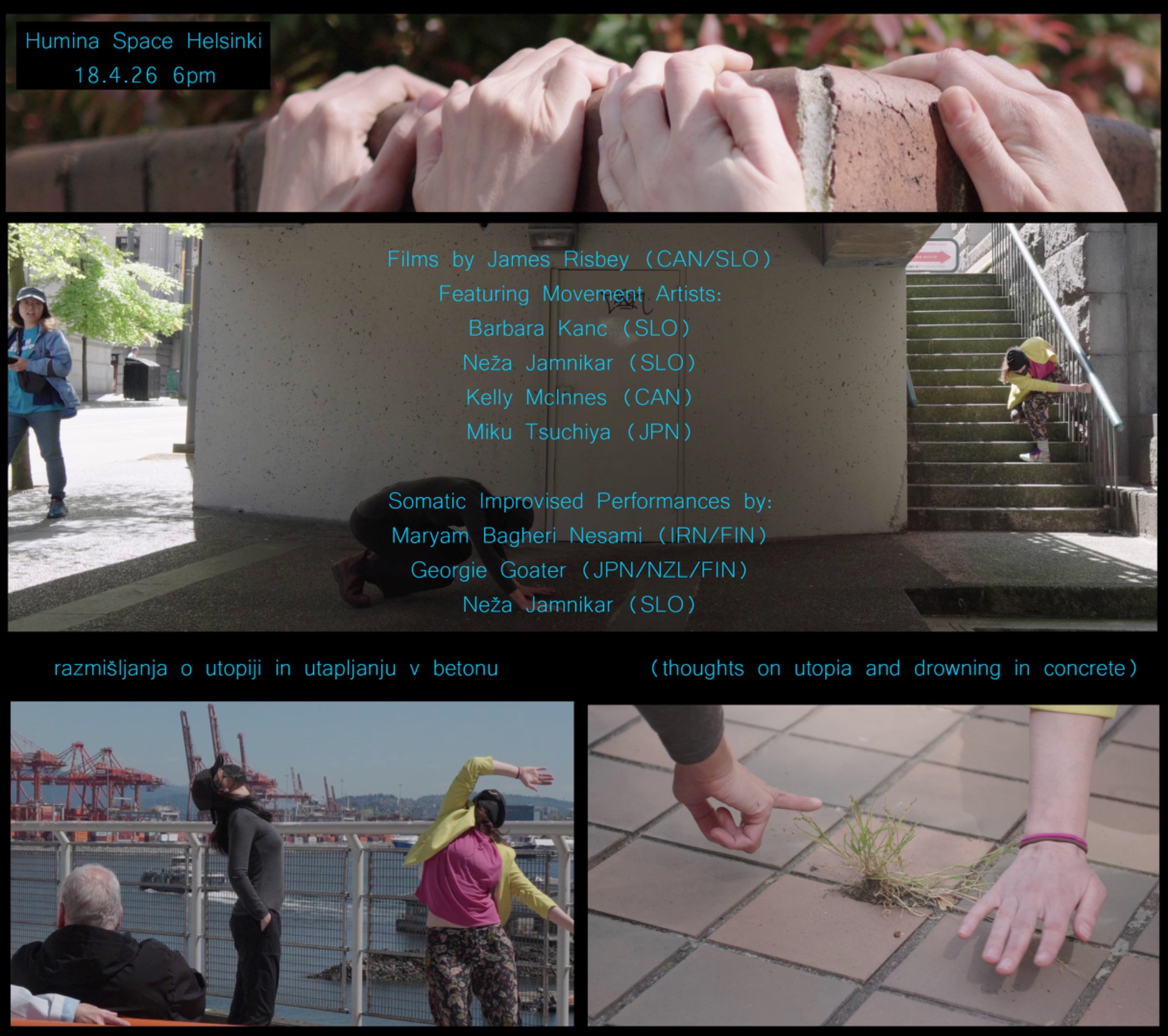 Through the lens of somatic movement and variations on the concerto, we gently offer an exhibition of Eco/Urban-somatic video screenings and live performance. Contemplations on reflecting dependencies, nature and humans as both caretakers and destroyers of each other.